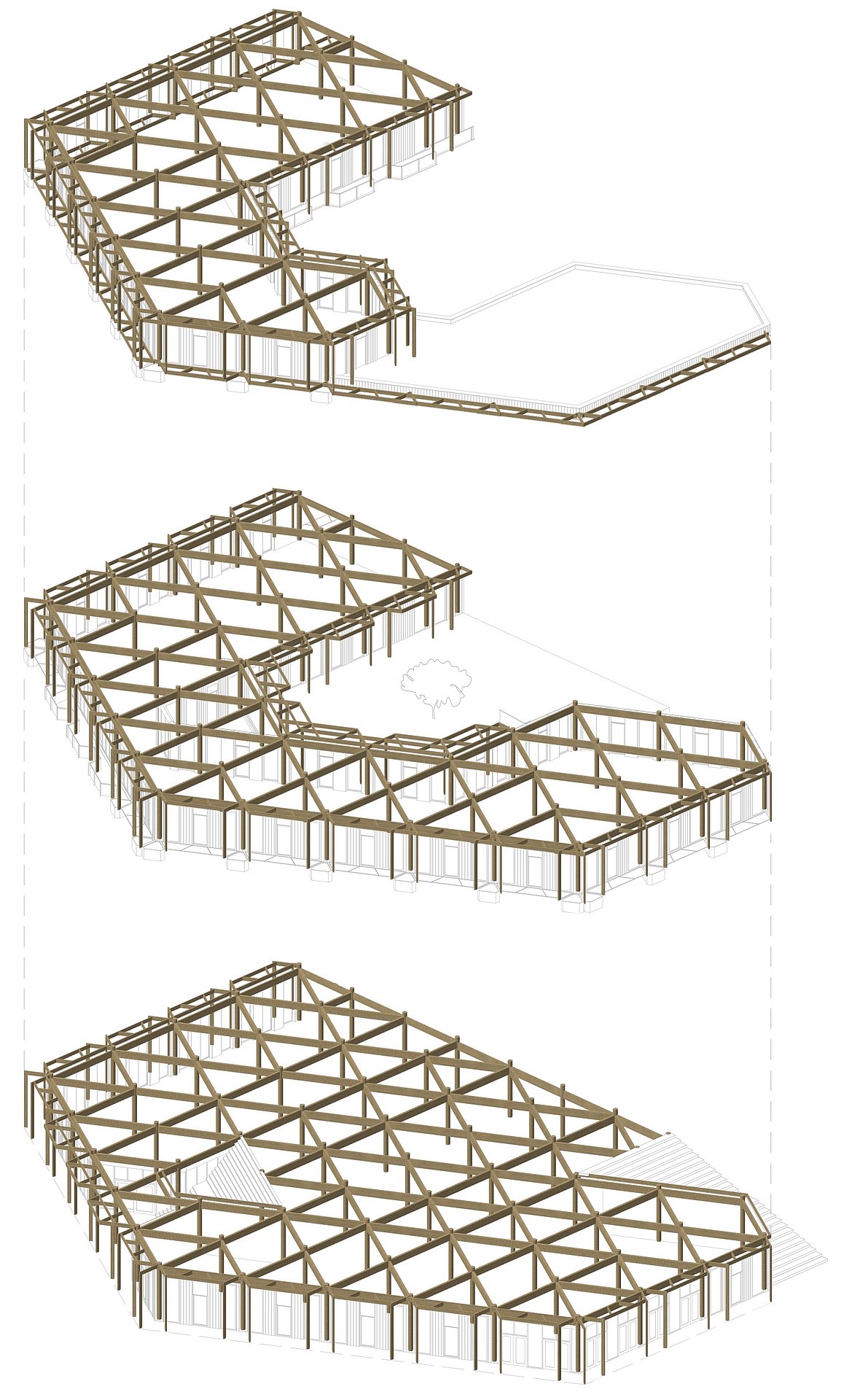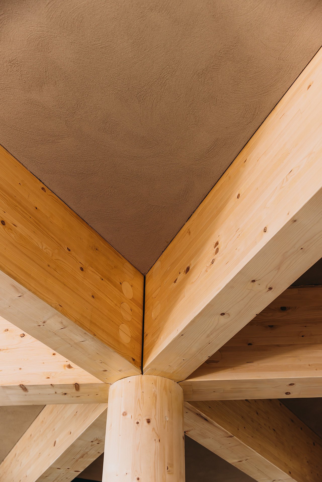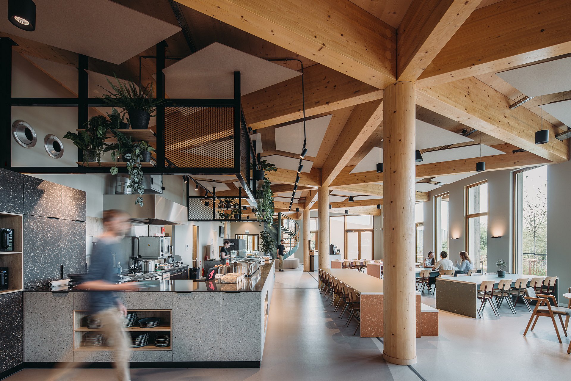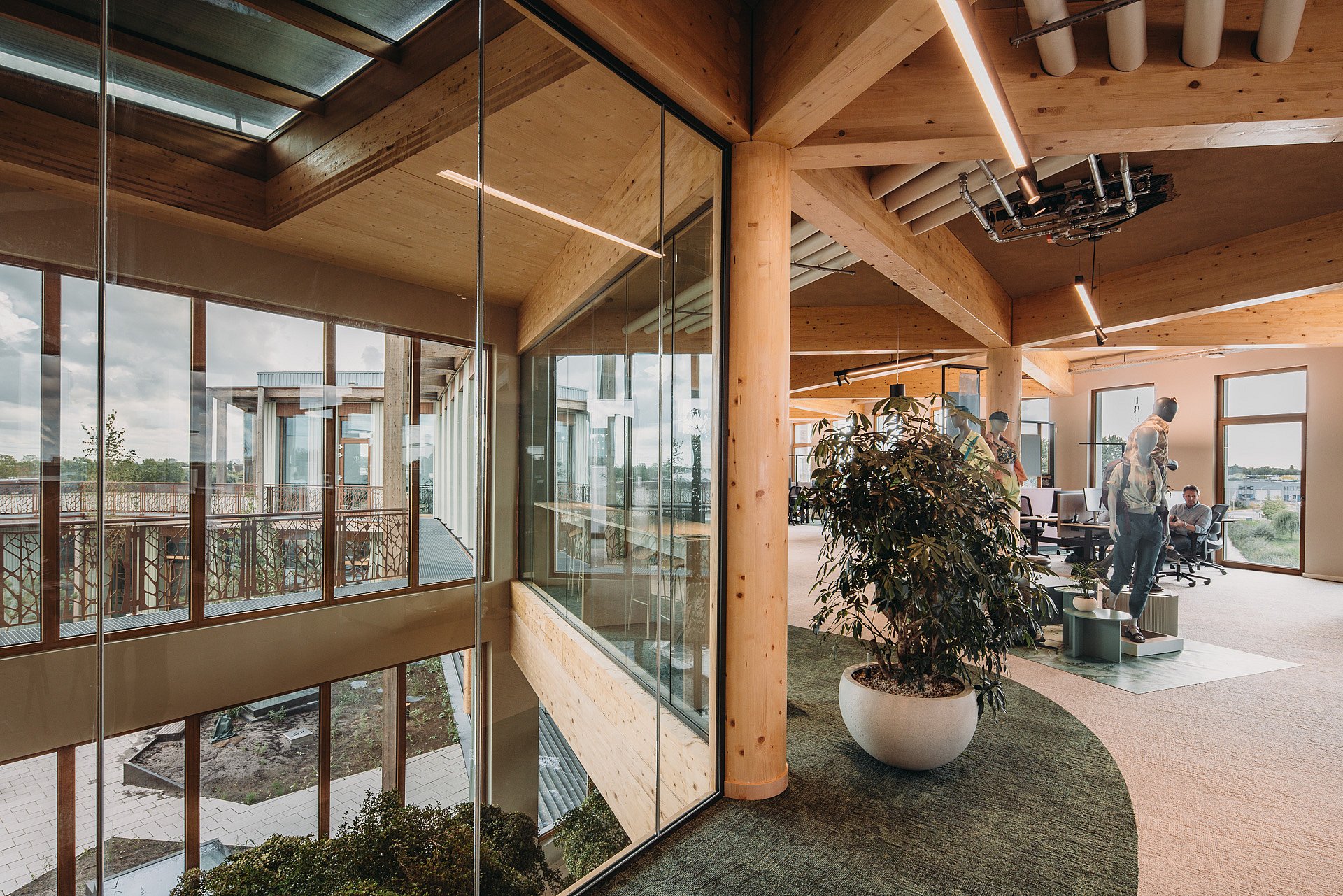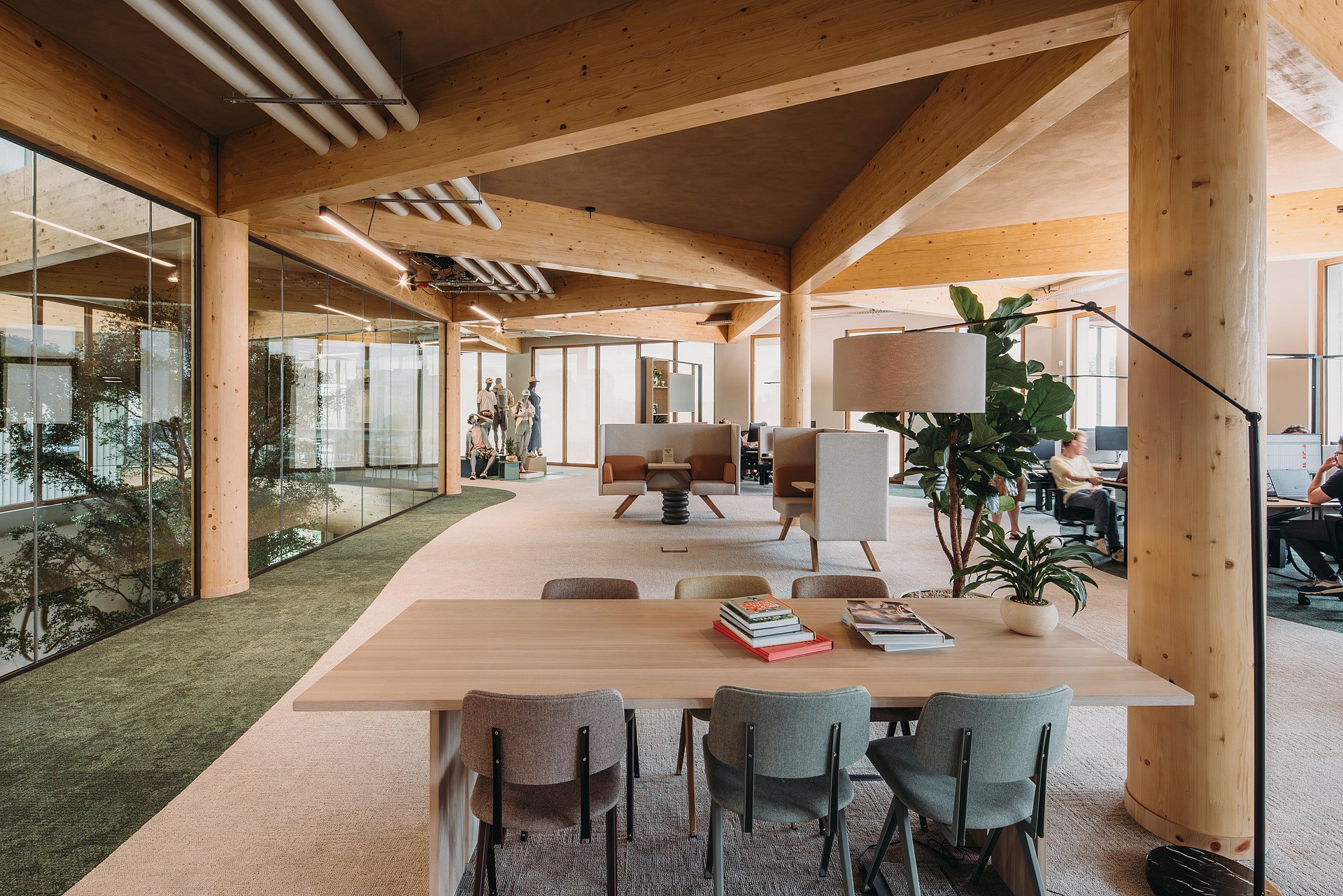 Maar ook in de rest van het hoofdkantoor komen de duurzame ambities van Bever naar voren. Zo is de constructie, op basis van een frame van driehoeken, volledig van hout en overal in het zicht gelaten. Samen met de ronde houten kolommen zorgt dat voor een interessant spel van diagonale lijnen. Bovendien is het gebouw flexibel in te delen, zodat toekomstige veranderingen in werkwijze en ruimtegebruik zonder structurele ingrepen zijn te verwerken.