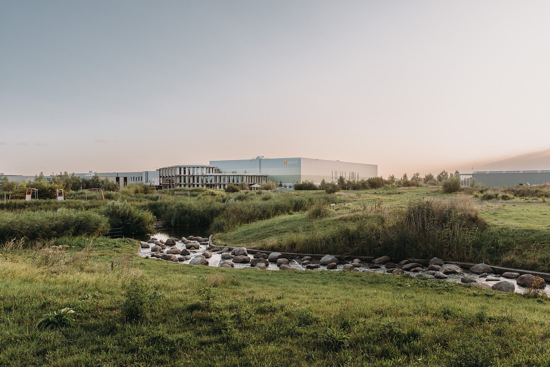 Buitenwerkplekken en gezellige zitjes nodigen de medewerkers uit tot informele besprekingen in de buitenlucht. Maar er is natuurlijk ook genoeg plek voor zomerse borrels en voor het testen van de nieuwste tenten. Want zoals het bekende credo van de outdoorketen luidt: ‘Buiten begint bij Bever’. En dat wordt met dit nieuwe gebouw volledig waargemaakt.