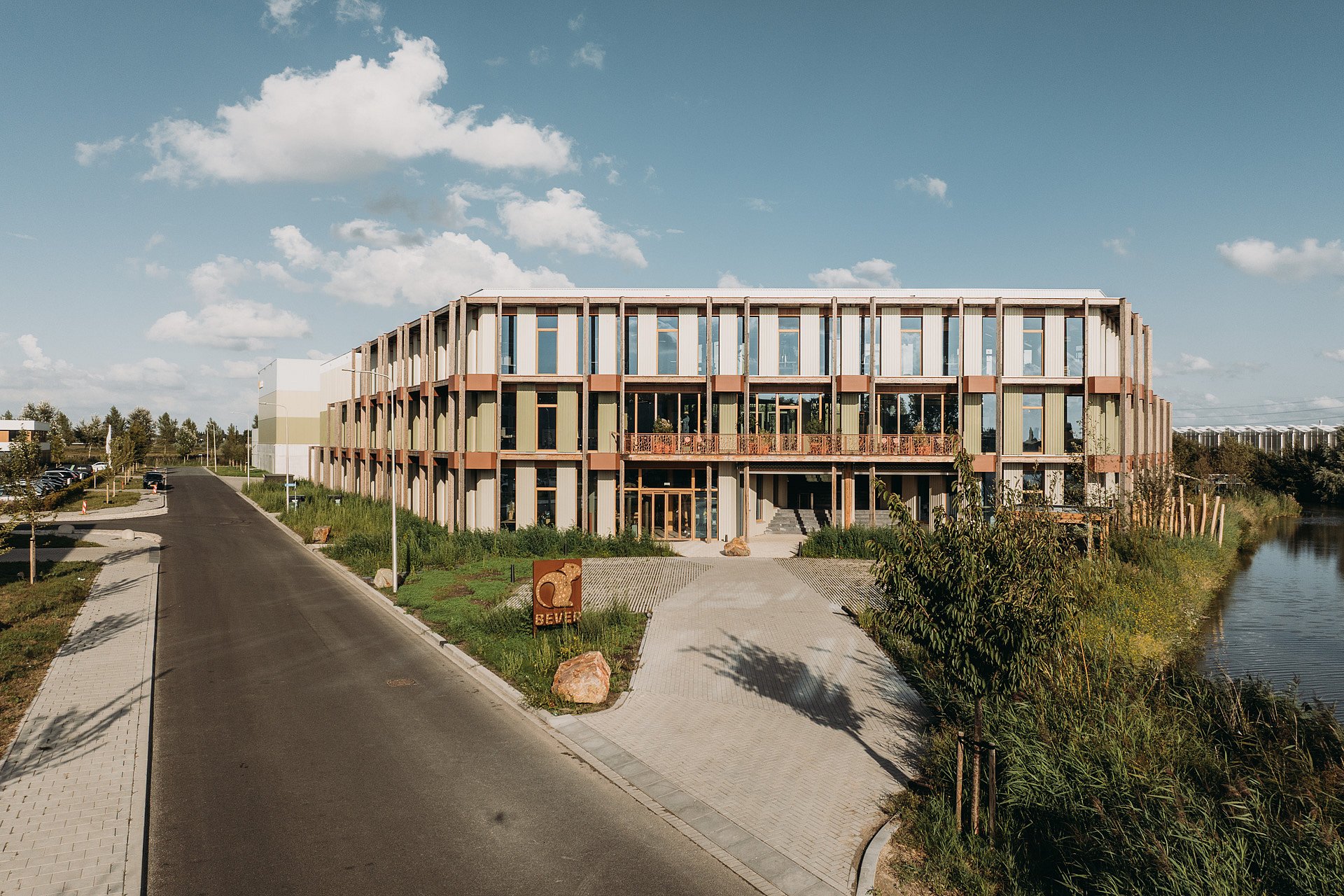 In het ontwerp heeft Bureau Kroner veel aandacht besteed aan de balans tussen architectuur en natuur. Bever koos niet voor niets voor deze mooie locatie, met water, groen en zelfs een buitenfitness in de achtertuin. Op die elementen speelt het nieuwe kantoor vol in.