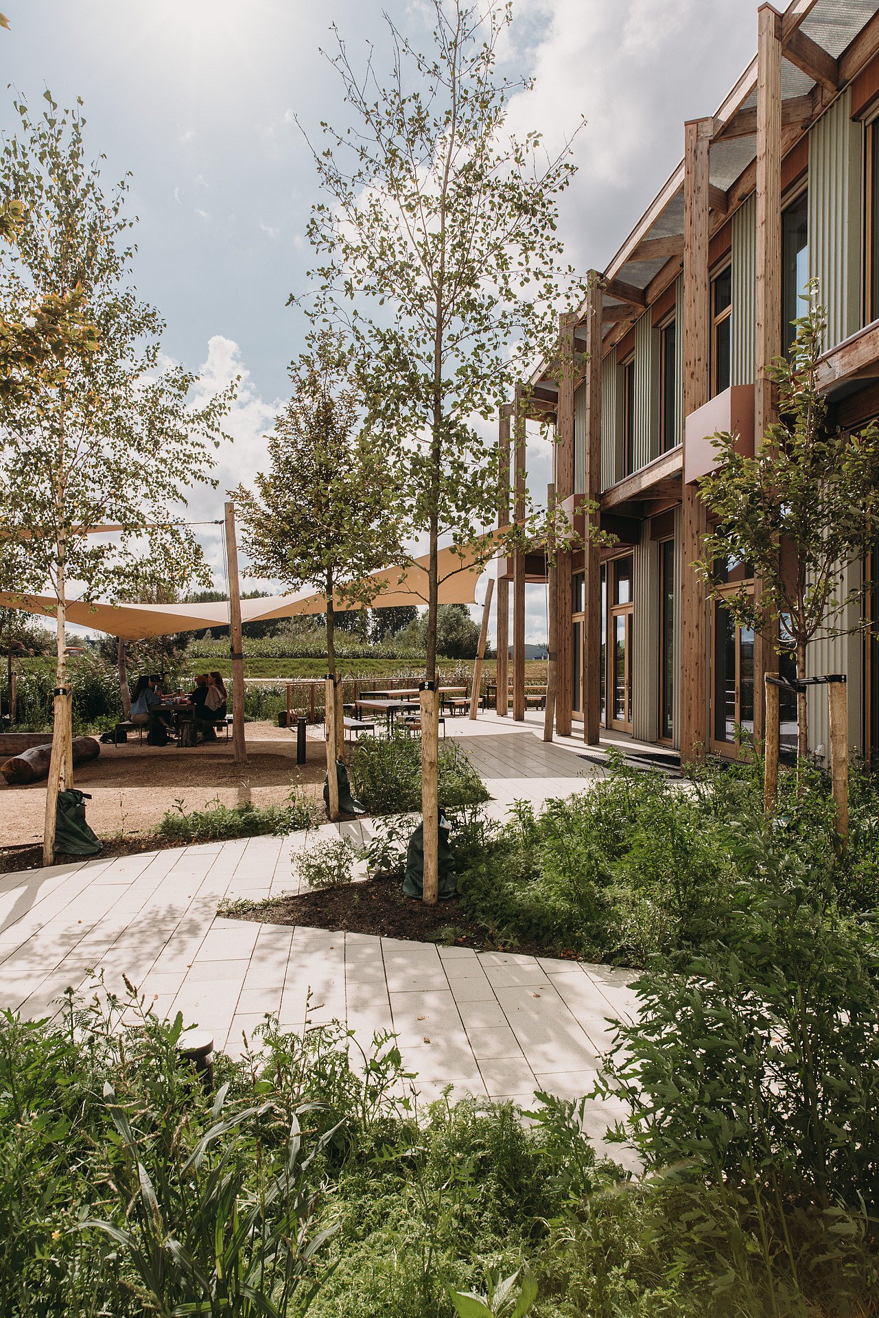 Dankzij een slimme stapeling van functies is het grote programma ondergebracht op de krappe kavel én ontstaat er plek voor aantrekkelijke buitenruimtes: van een uitnodigende voortuin tot aan een weelderige achtertuin en van een binnenhof met rustige werktuin tot aan een kruidentuin op het dak. Deze zijn ingericht met inheemse planten, nestkasten en bijenhotels. Daarnaast is er veel ruimte gecreëerd voor gezamenlijke activiteiten in de buitenlucht.