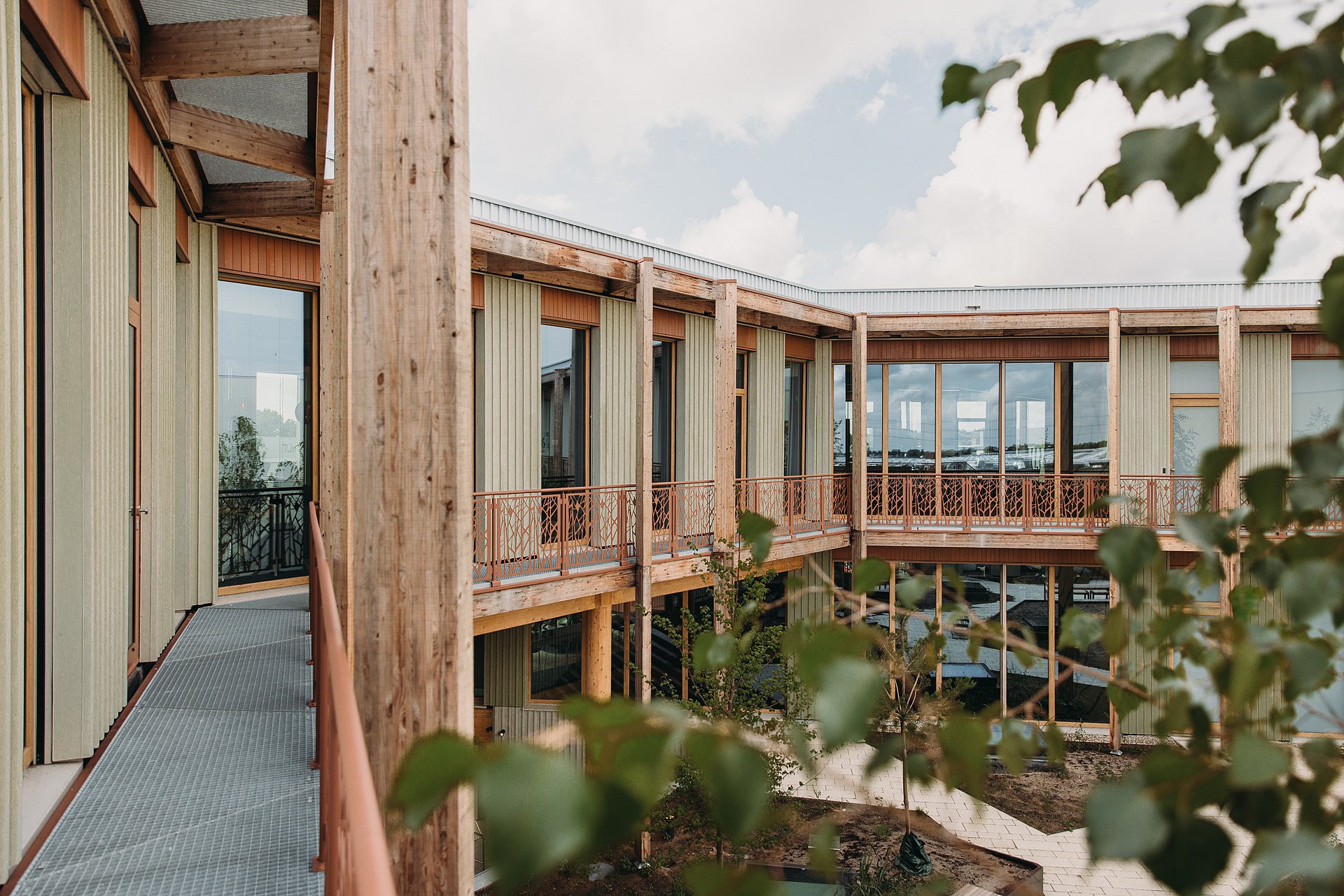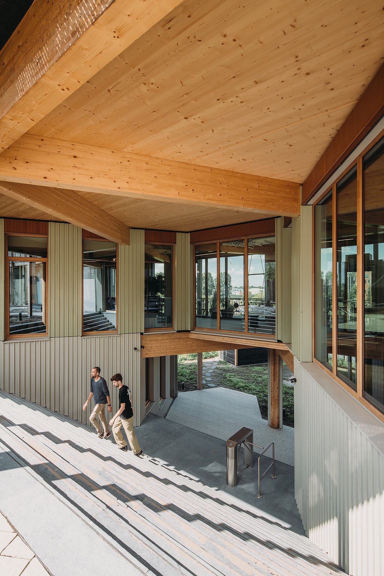Verdiepingshoge ramen bieden een optimaal zicht op de omgeving. Tegelijkertijd zorgt de goede verhouding tussen open en dichte delen voor een energiezuinig gebouw. En de houten pergolastructuur die voor de gevel is geplaatst, functioneert niet alleen als zonwering maar draagt met de geïntegreerde plantenbakken ook nog eens bij aan het groene uitzicht van de medewerkers.