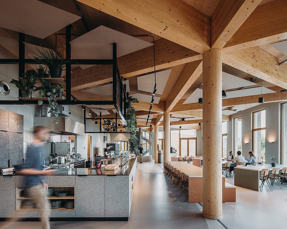 Maar ook in de rest van het hoofdkantoor komen de duurzame ambities van Bever naar voren. Zo is de constructie, op basis van een frame van driehoeken, volledig van hout en overal in het zicht gelaten. Samen met de ronde houten kolommen zorgt dat voor een interessant spel van diagonale lijnen. Bovendien is het gebouw flexibel in te delen, zodat toekomstige veranderingen in werkwijze en ruimtegebruik zonder structurele ingrepen zijn te verwerken.
