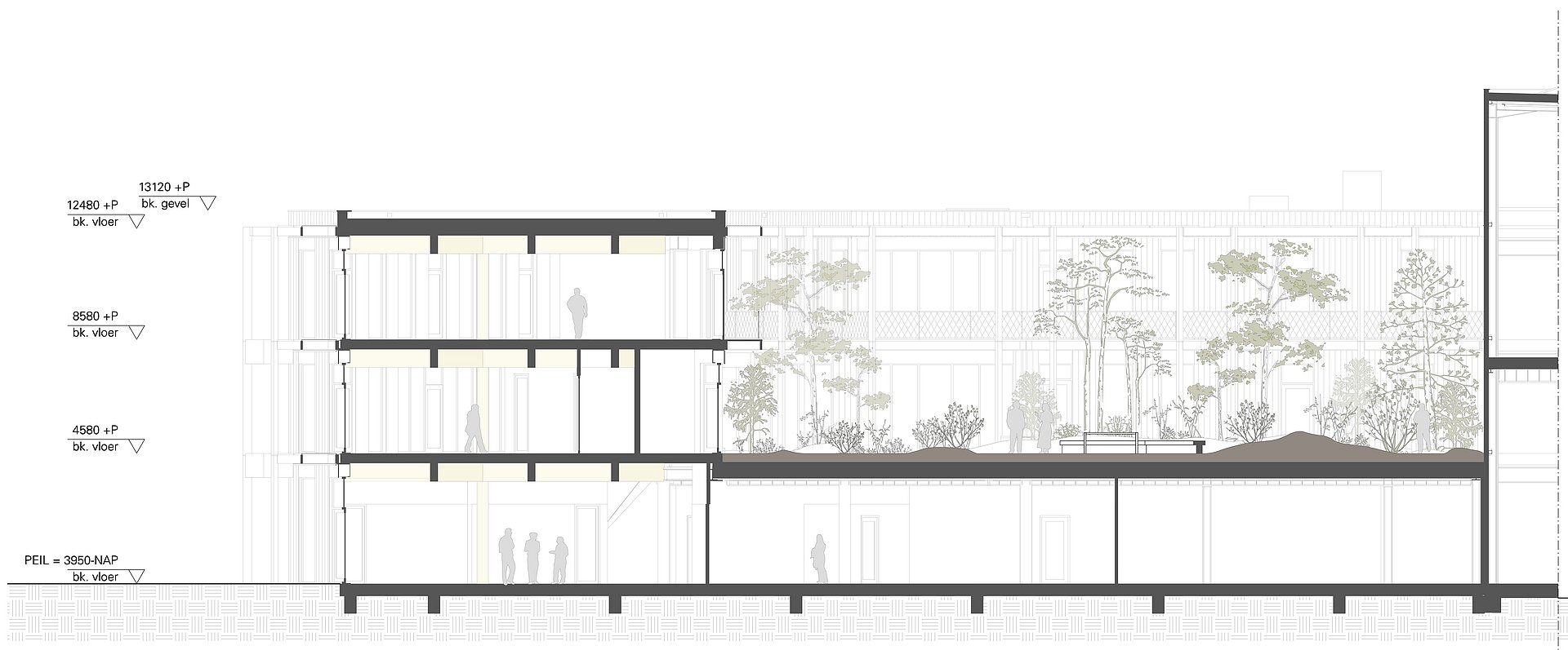 Dankzij een slimme stapeling van functies is het grote programma ondergebracht op de krappe kavel én ontstaat er plek voor aantrekkelijke buitenruimtes: van een uitnodigende voortuin tot aan een weelderige achtertuin en van een binnenhof met rustige werktuin tot aan een kruidentuin op het dak. Deze zijn ingericht met inheemse planten, nestkasten en bijenhotels. Daarnaast is er veel ruimte gecreëerd voor gezamenlijke activiteiten in de buitenlucht.