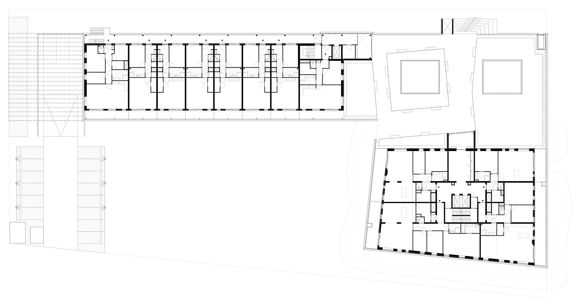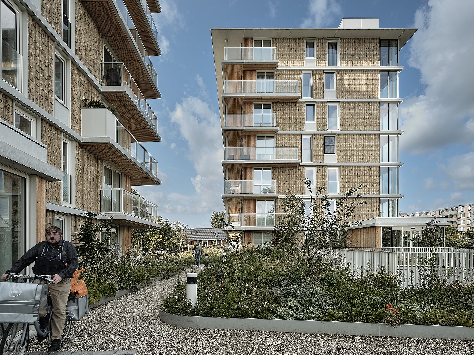De entrees van beide gebouwen liggen aan een verhoogde daktuin; een semi-privaat entreegebied. Bewoners parkeren uit het zicht in een half verdiepte parkeergarage onder het complex. Parkeerplekken op het maaiveld zijn voornamelijk bestemd voor deelauto’s en bieden daarmee extra duurzame mobiliteit-opties voor de bewoners.