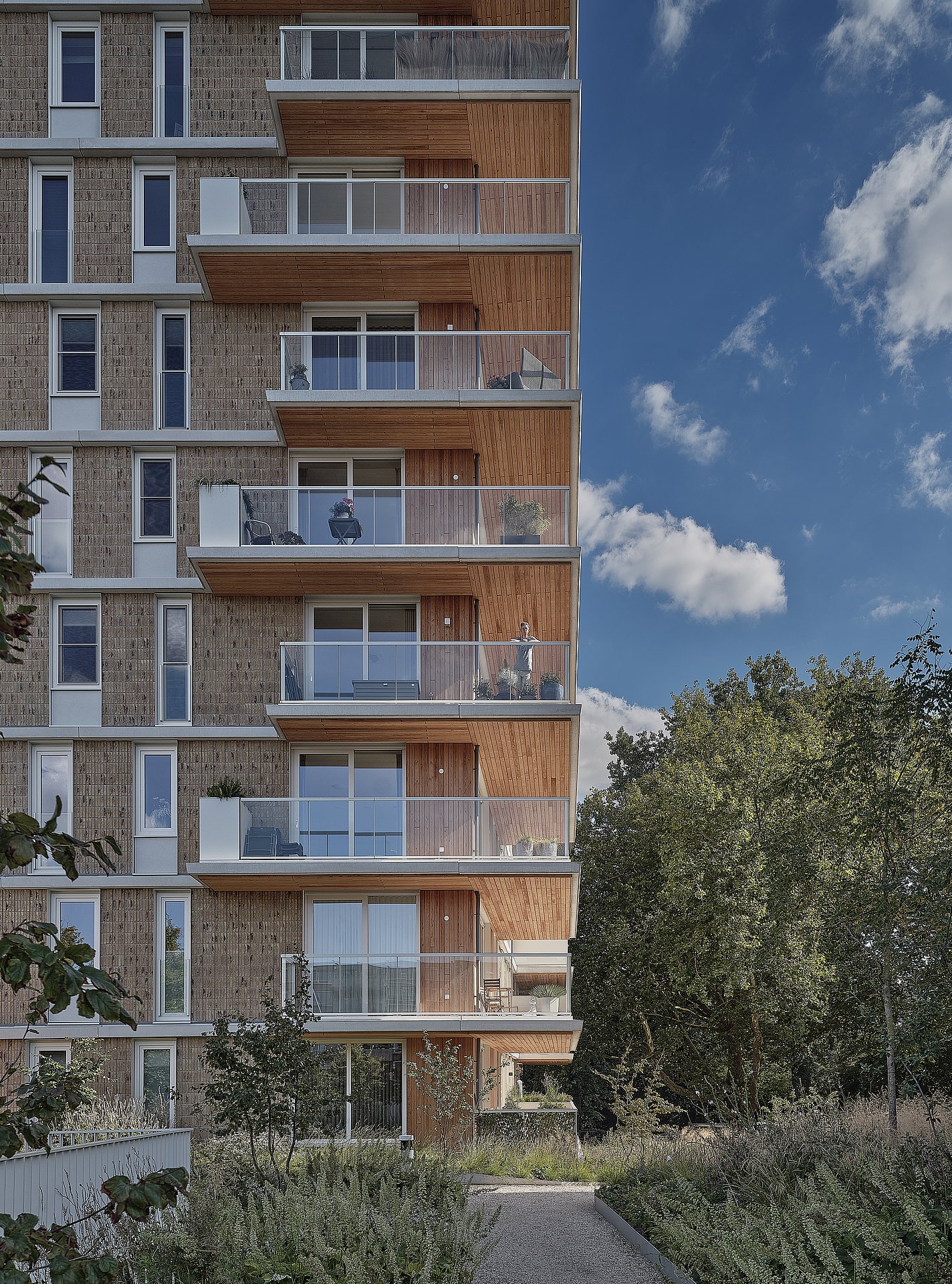 De gevels zijn opgebouwd uit horizontale betonbanden waartussen staand metselwerk en verdiepingshoge gevelopeningen elkaar in een speels ritme afwisselen. Uiterst royale overhoekse balkons, die toegankelijk zijn via brede schuifdeuren, geven bewoners de mogelijkheid maximaal te genieten van de parkachtige omgeving en dragen daarmee bij aan een sterke verbinding tussen binnen en buiten.