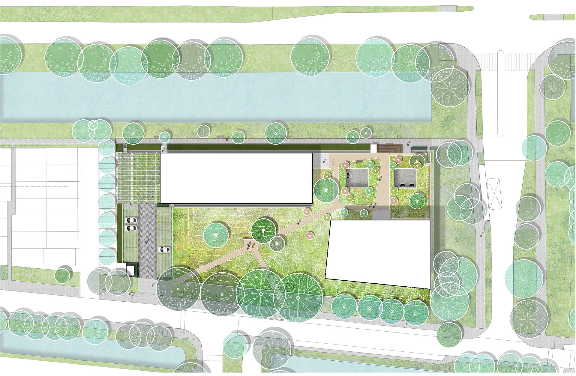 Op subtiele wijze is er een overgang tussen openbare ruimte en groene semiopenbare ruimte gecreëerd. Regenwater wordt op een mooie natuurlijke wijze langzaam over de locatie heen afgevoerd naar een lichte inkeping in het maaiveld op de overgang naar de gemeentelijke openbare ruimte. Ook bij heftige buien wordt het water op deze manier op de locatie zelf opgevangen en verdeeld.