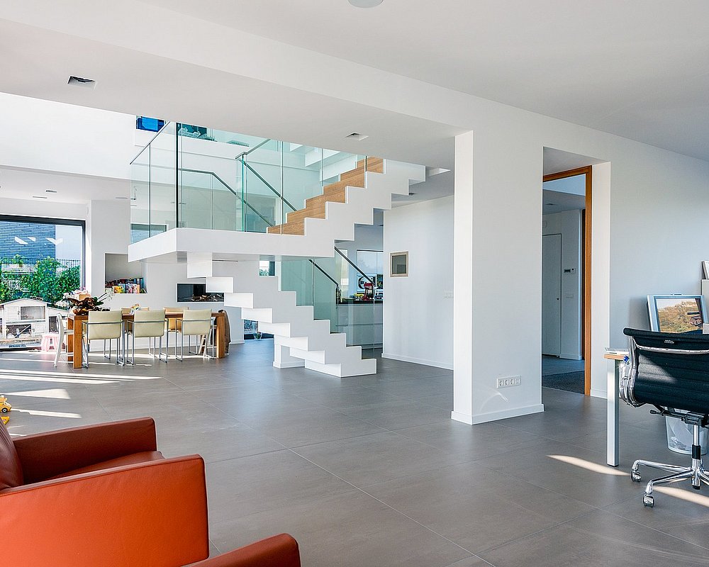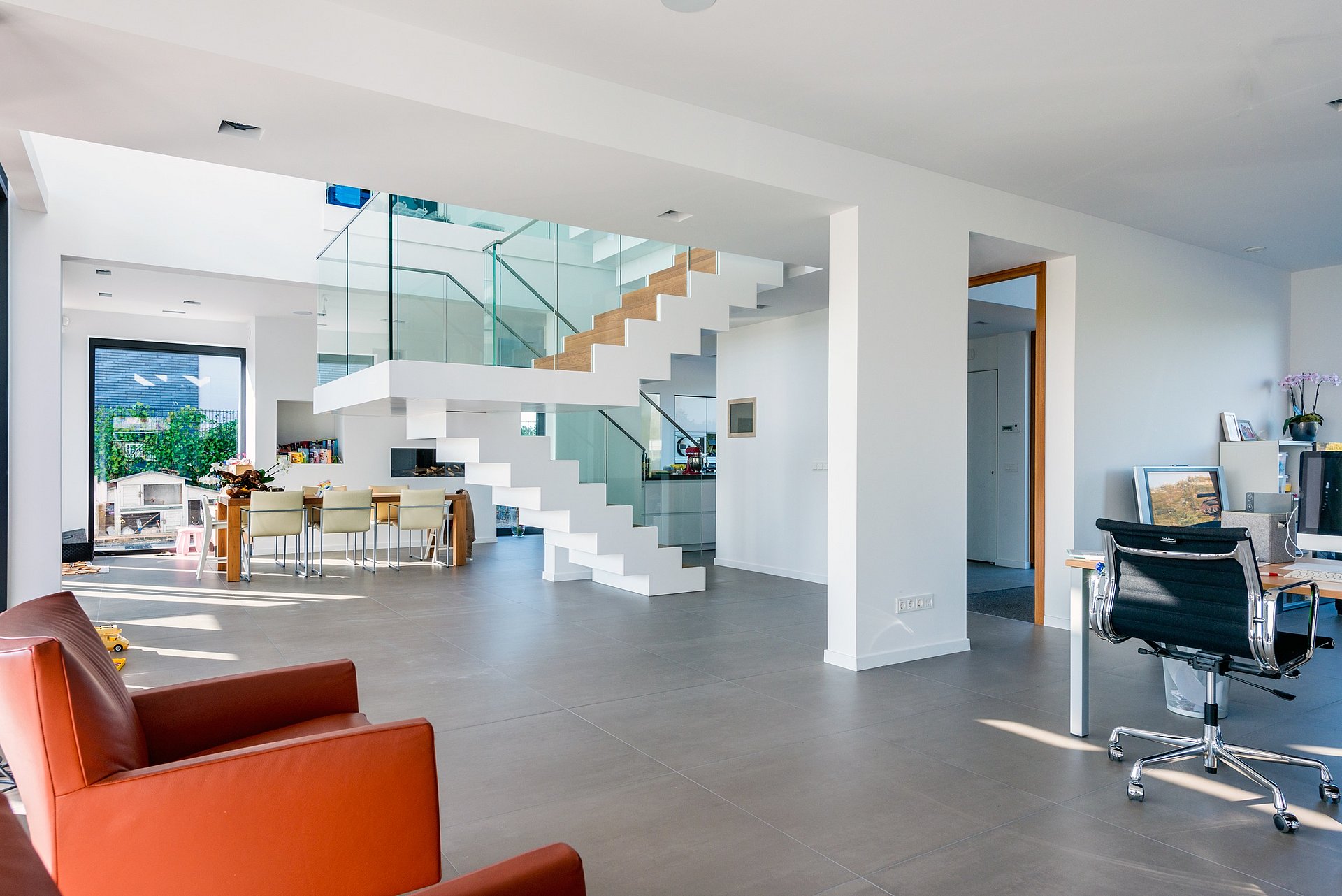 Bureau Kroner maakte het ontwerp waarin deze wensen werden vertaald in een sterk concept, met open doorlopende ruimtes op de begane grond, een sculpturale centrale trap die de verdiepingen op een ruimtelijke manier verbindt, en een gevel waarin openheid en afscherming op een spannende manier afwisselen.