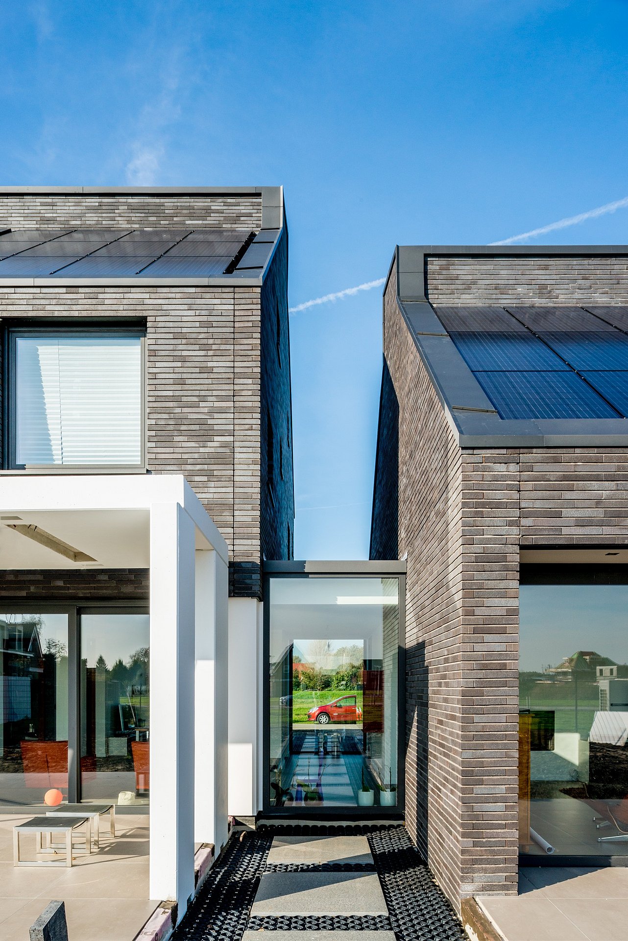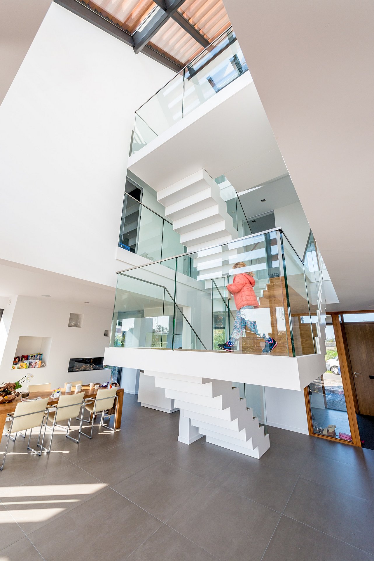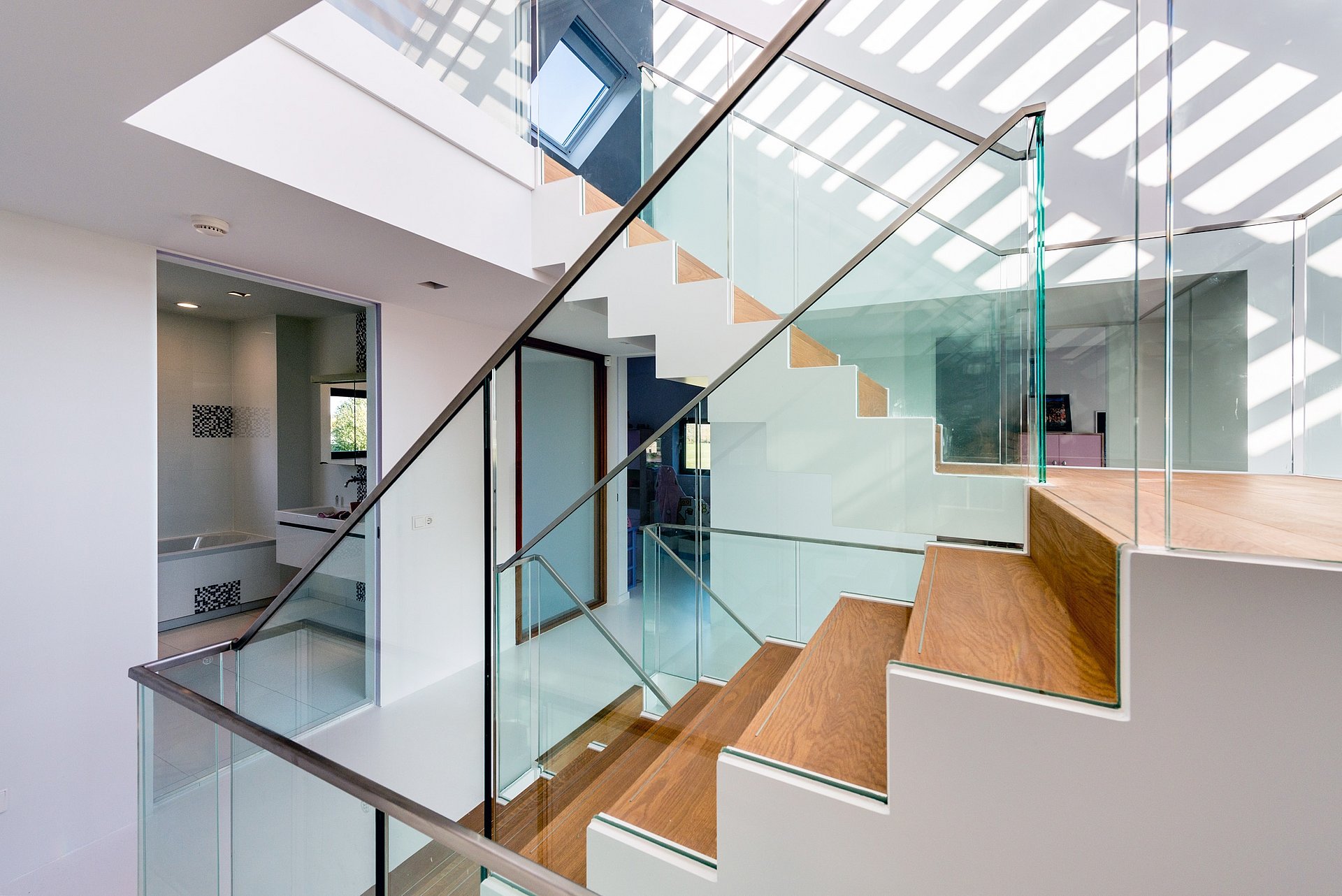 Ook passief is in het ontwerp rekening gehouden met warmte-instraling in de winter en afscherming van de zon in de zomer door de lamellen aan de buitenzijde van het glas boven de trappen en een brede brise-soleil boven het terras, direct achter de woning.