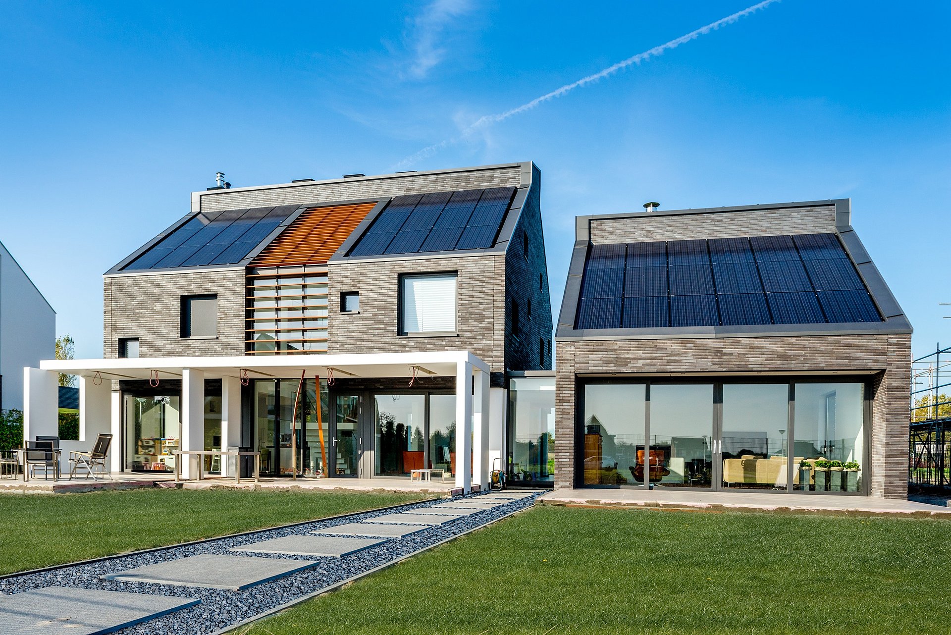De zonnepanelen zijn in het ontwerp van het dak geïntegreerd. Er is veel ruimte gecreëerd voor de duurzame installaties om te verwarmen en te koelen. Een warmtepomp staat buiten in de tuin.
