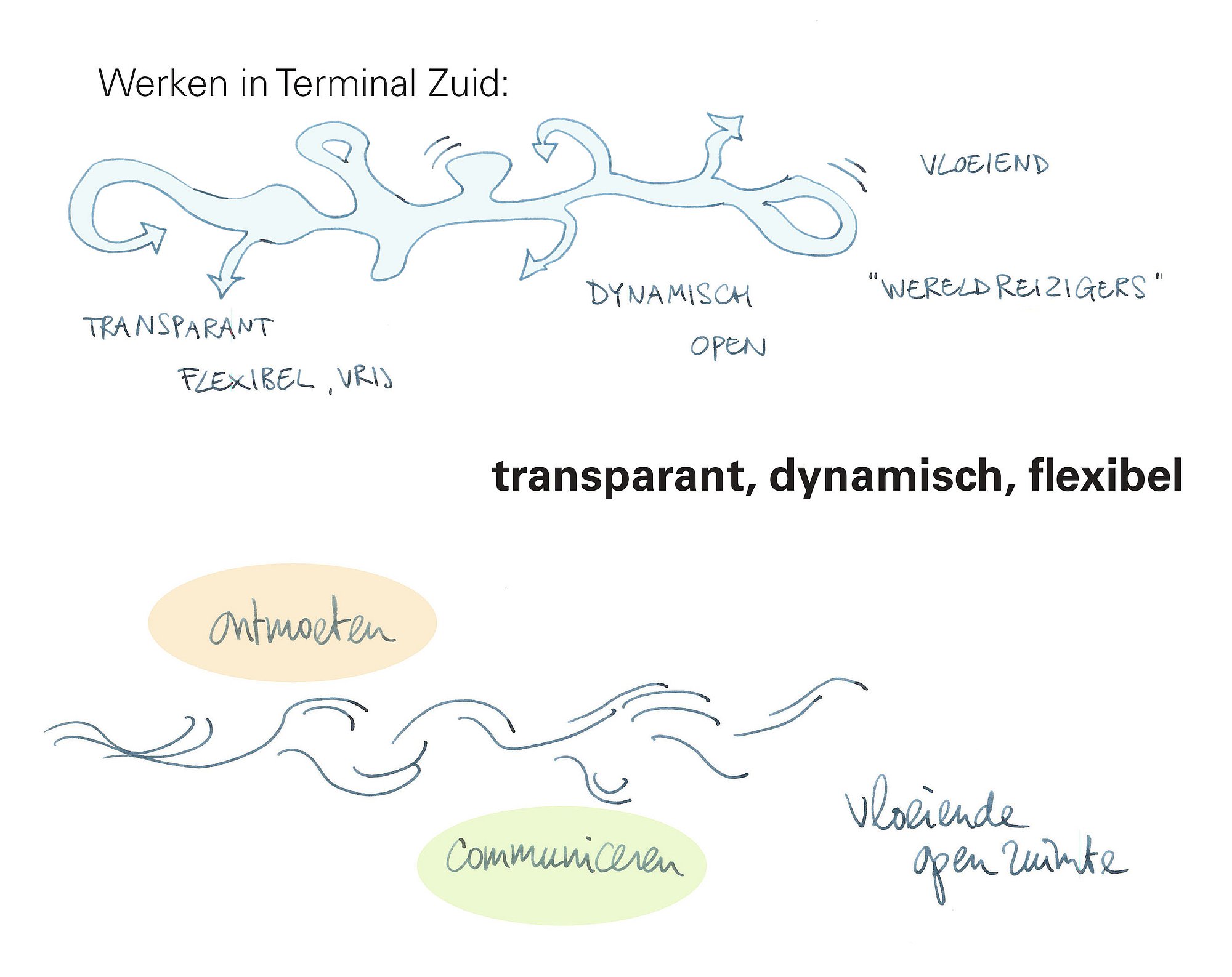 Conceptschets voor het interieur: een vloeiende, open ruimte past bij het karakter van 3W (Wereldwijd werken)