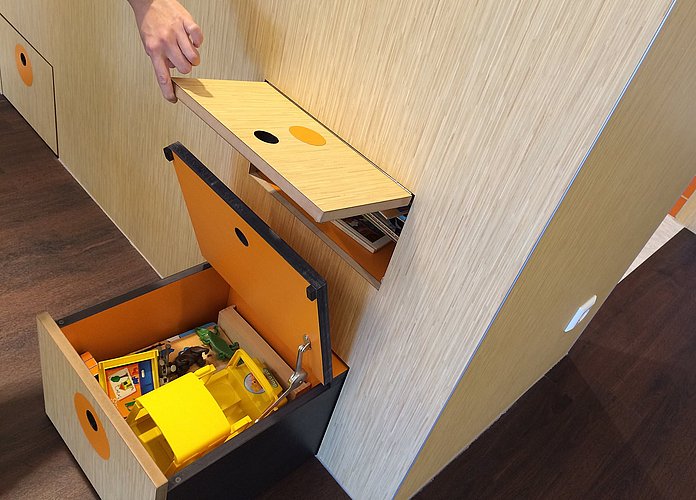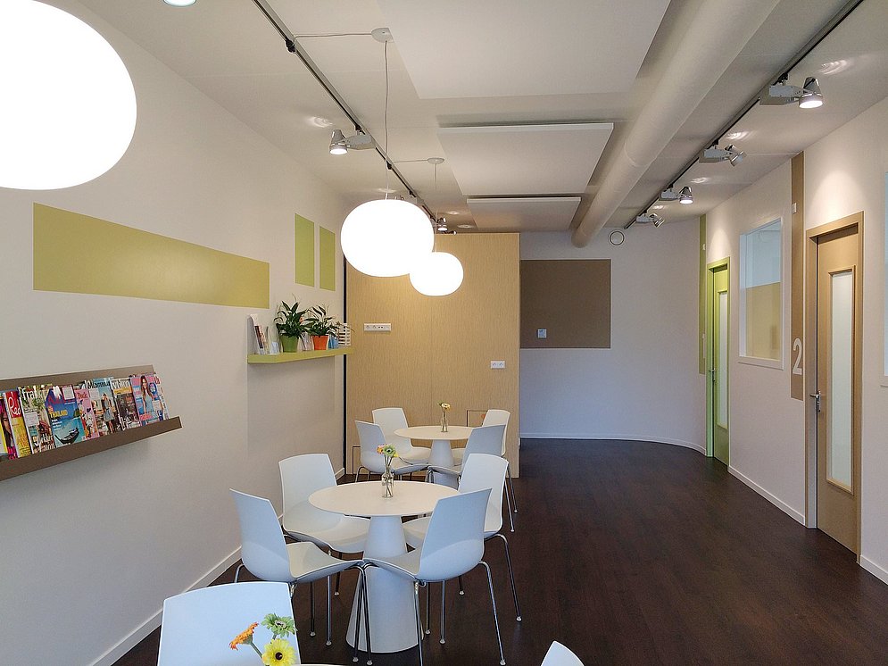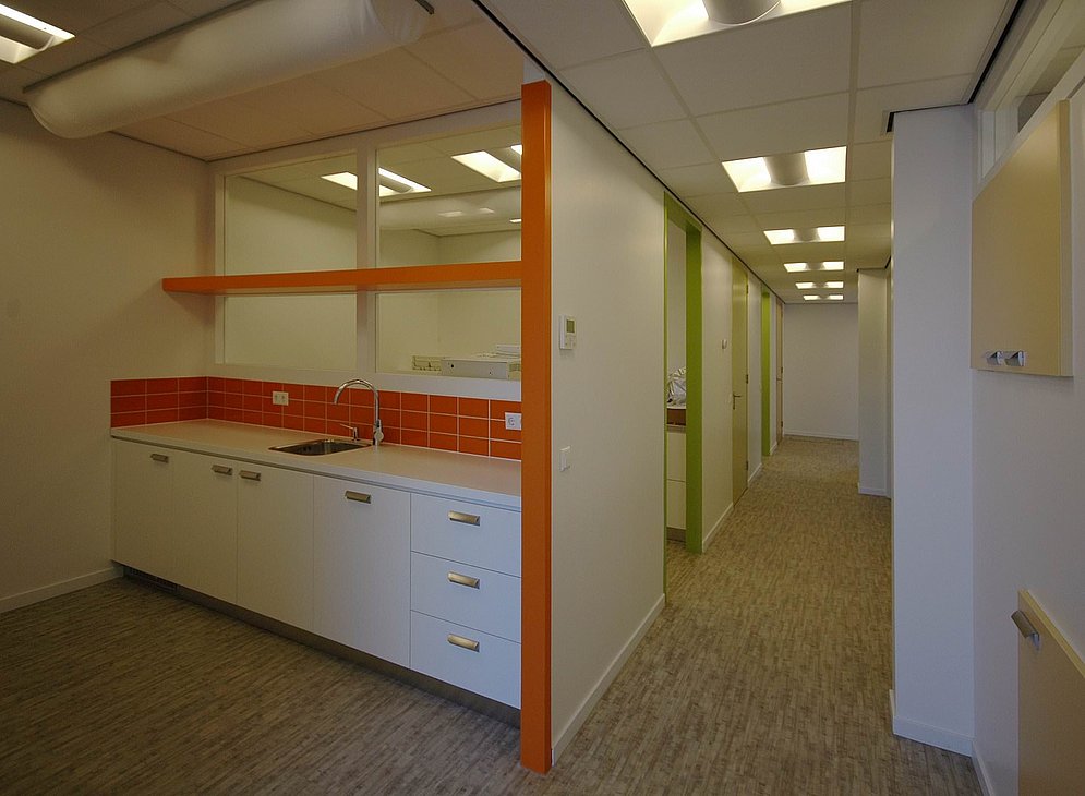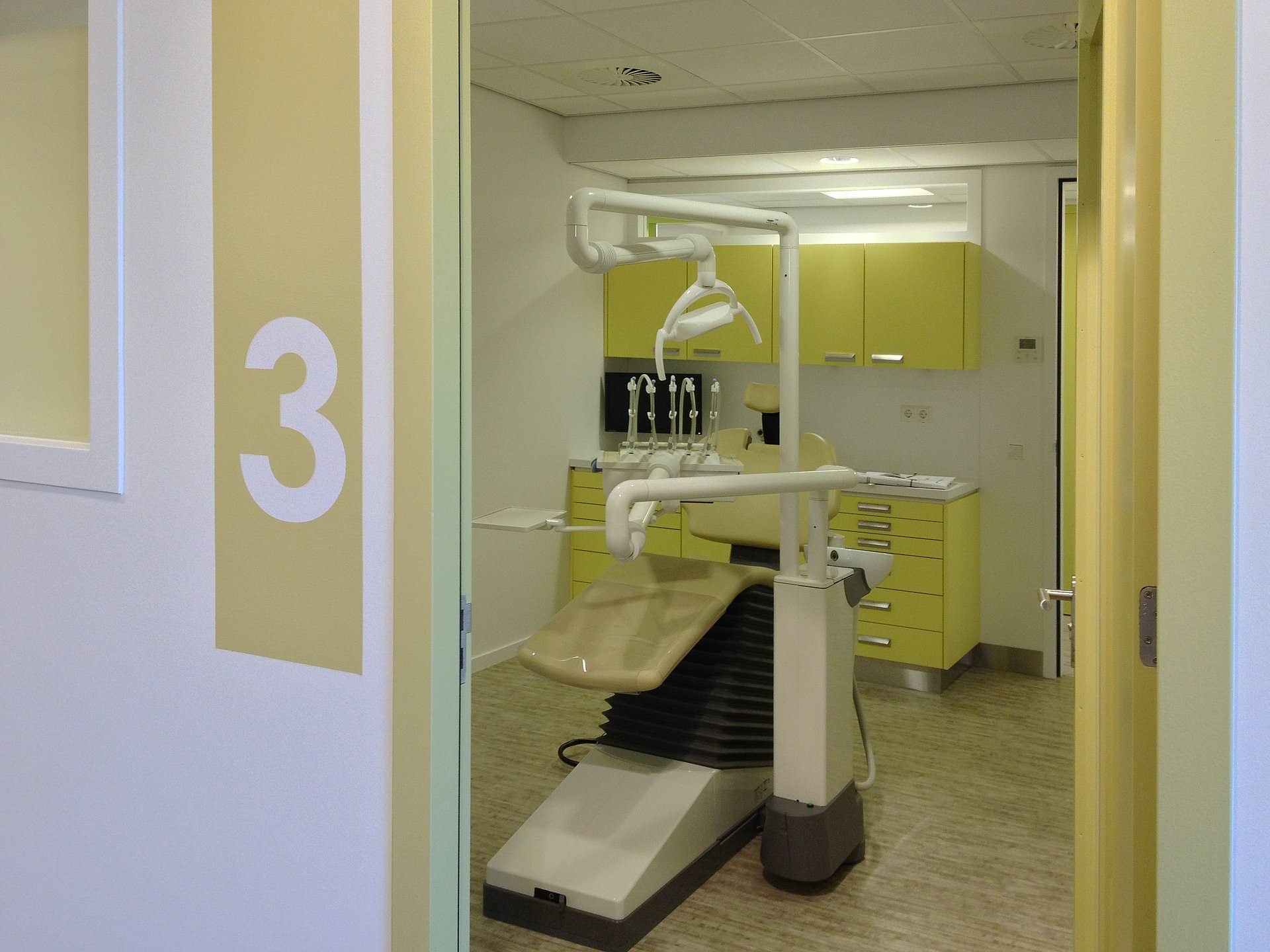 De inrichting, met warme kleuren en natuurlijke materialen, geeft een prettige ontspannen sfeer, zowel in de wacht- als behandelruimtes. Het ontwerp wordt afgemaakt met een afgestemd kleurconcept met accenten in kleurvlakken en bijzondere meubels voor ontvangst en poetshoek.