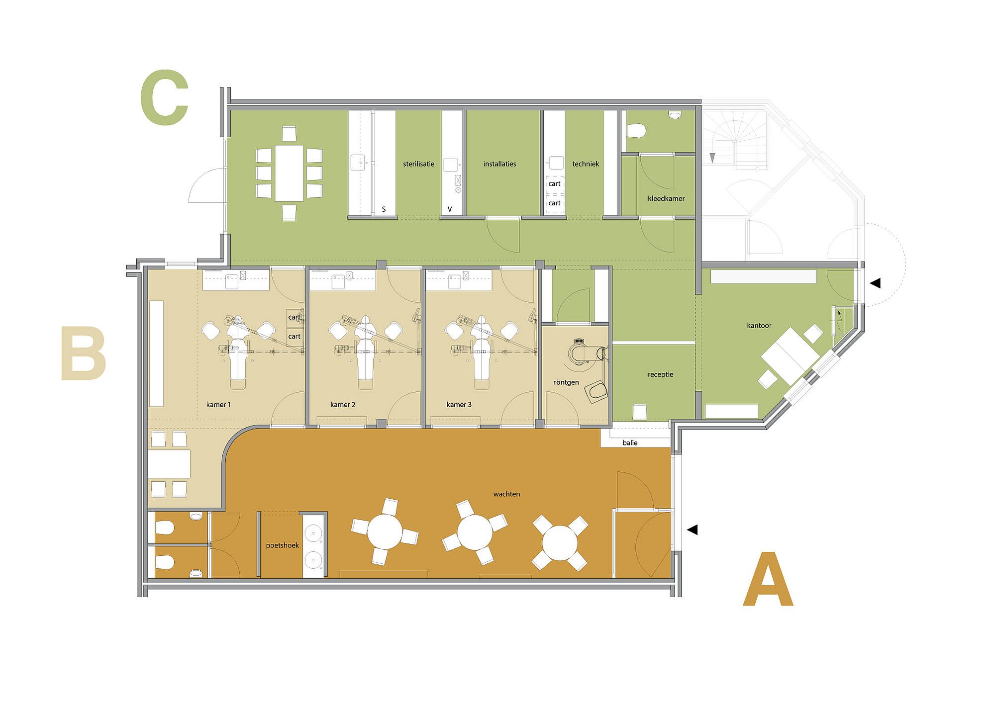 Bureau Kroner optimaliseerde de plattegrond, zodat de praktijk zowel voor klanten als voor medewerkers overzichtelijk en praktisch is. Ook met een wat kleinere bezetting is er open contact met de klanten, door uitgekiende zichtlijnen.