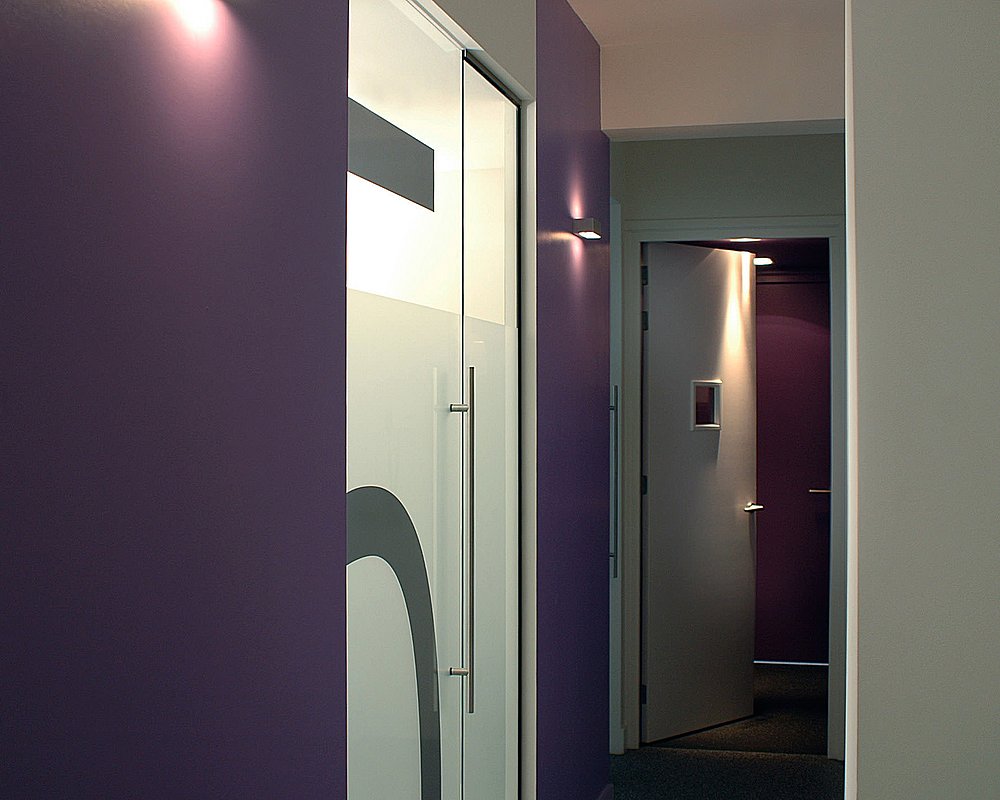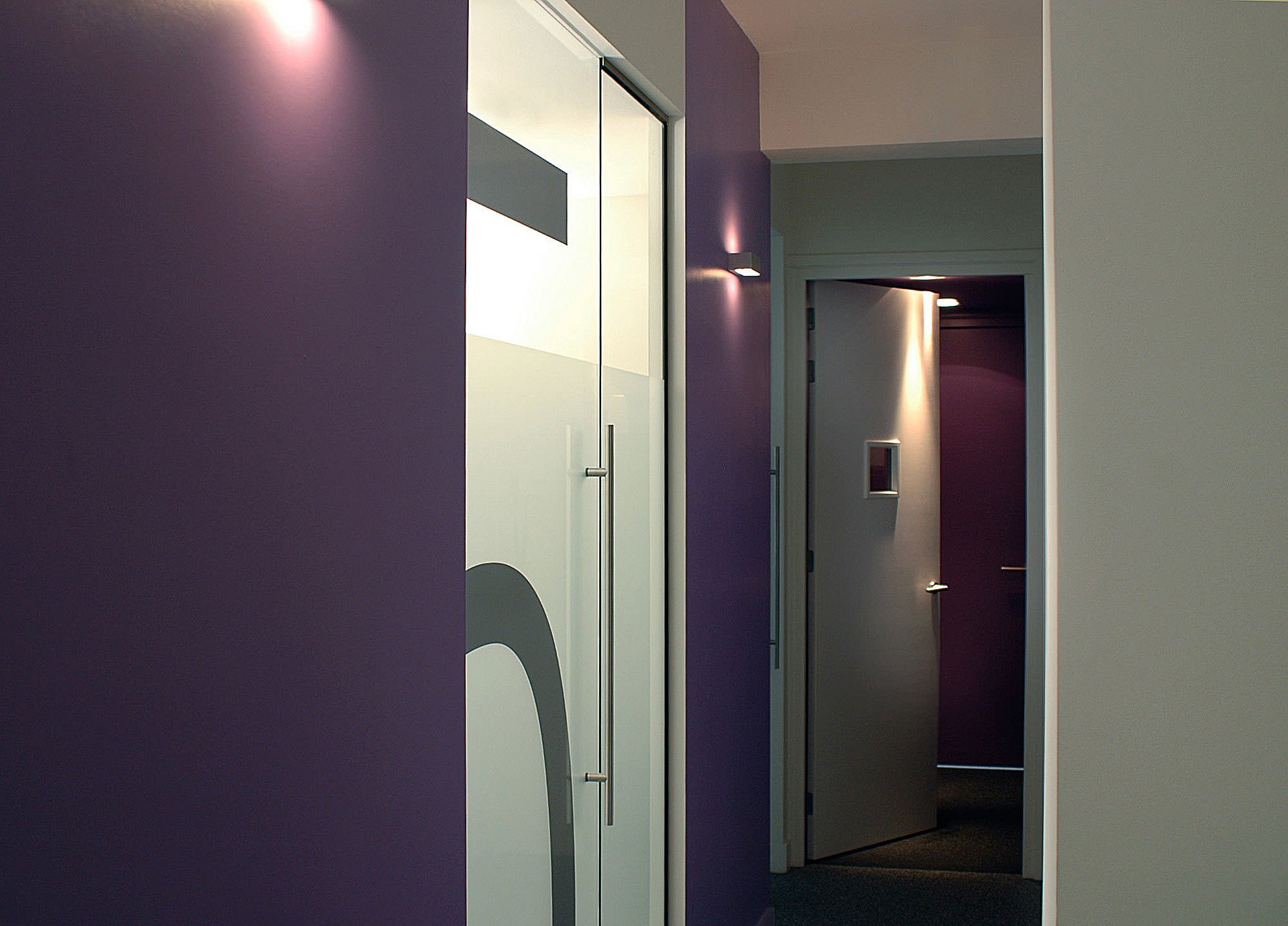 Door de glazen puien en een effectief kleurgebruik krijgt de praktijk een licht en transparant karakter, terwijl de oorspronkelijke structuur van het gebouw volledig intact blijft.