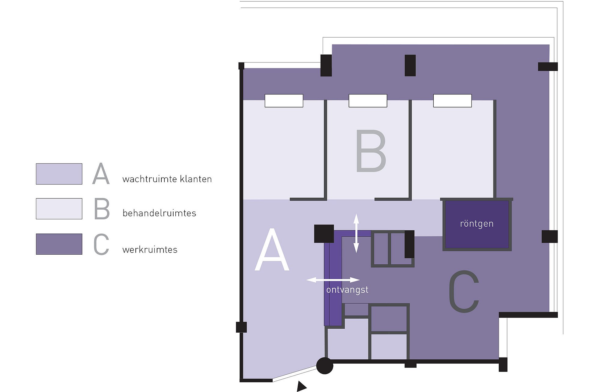 De indeling van de praktijk volgt het 'ABC-principe': wachtruimte, behandelkamers en werkruimtes zijn functioneel en visueel gescheiden.