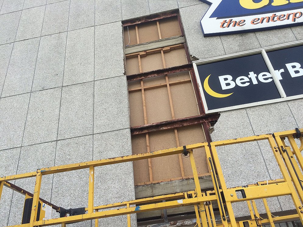 De bestaande gevels... betonplaten begonnen los te laten en uit de gevel te vallen.