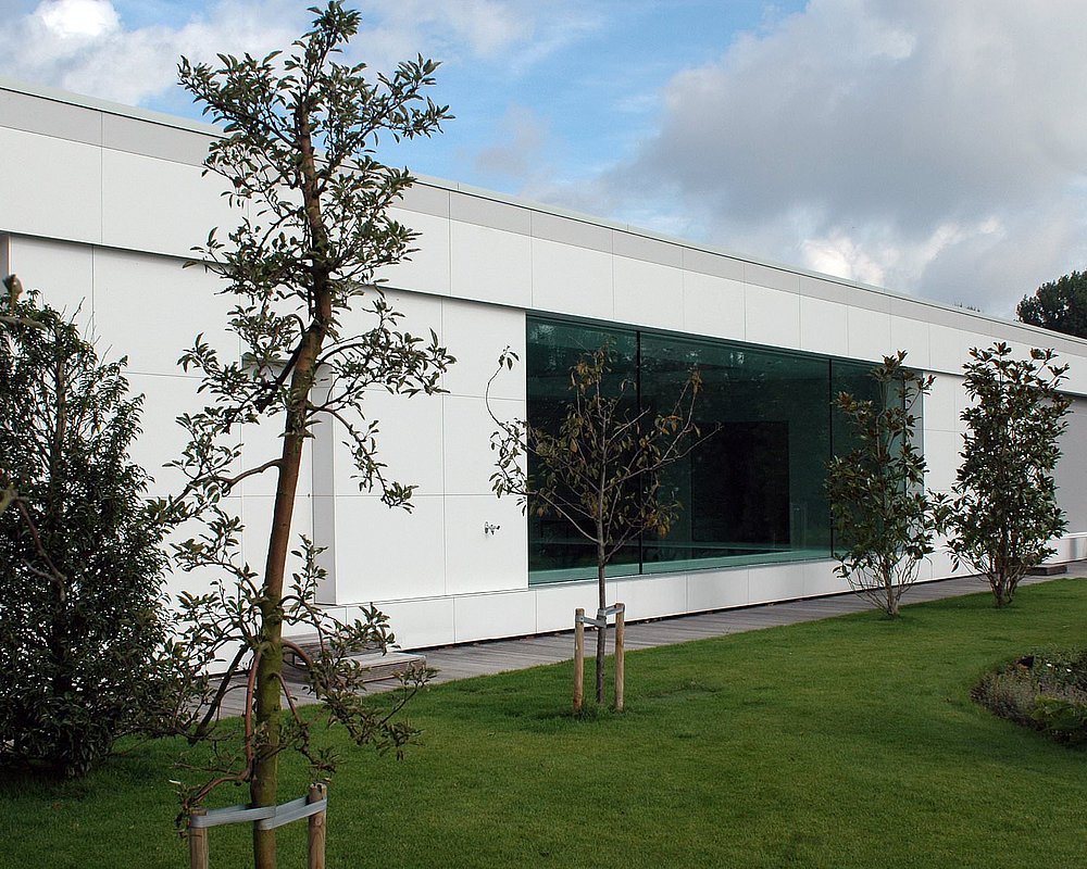 De klassieke opbouw van de plattegrond wordt gecombineerd met een strakke, abstracte gevel in witte natuursteen.